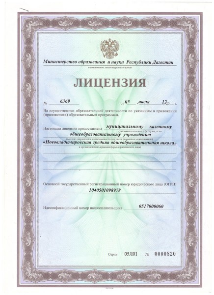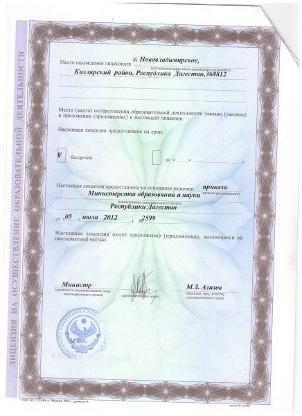 | Адрес местонахождения образовательной организации* | Российская Федерация Республика Дагестан, Кизлярский район с.Нововладимирское ул.Ленина 26, 368812 |